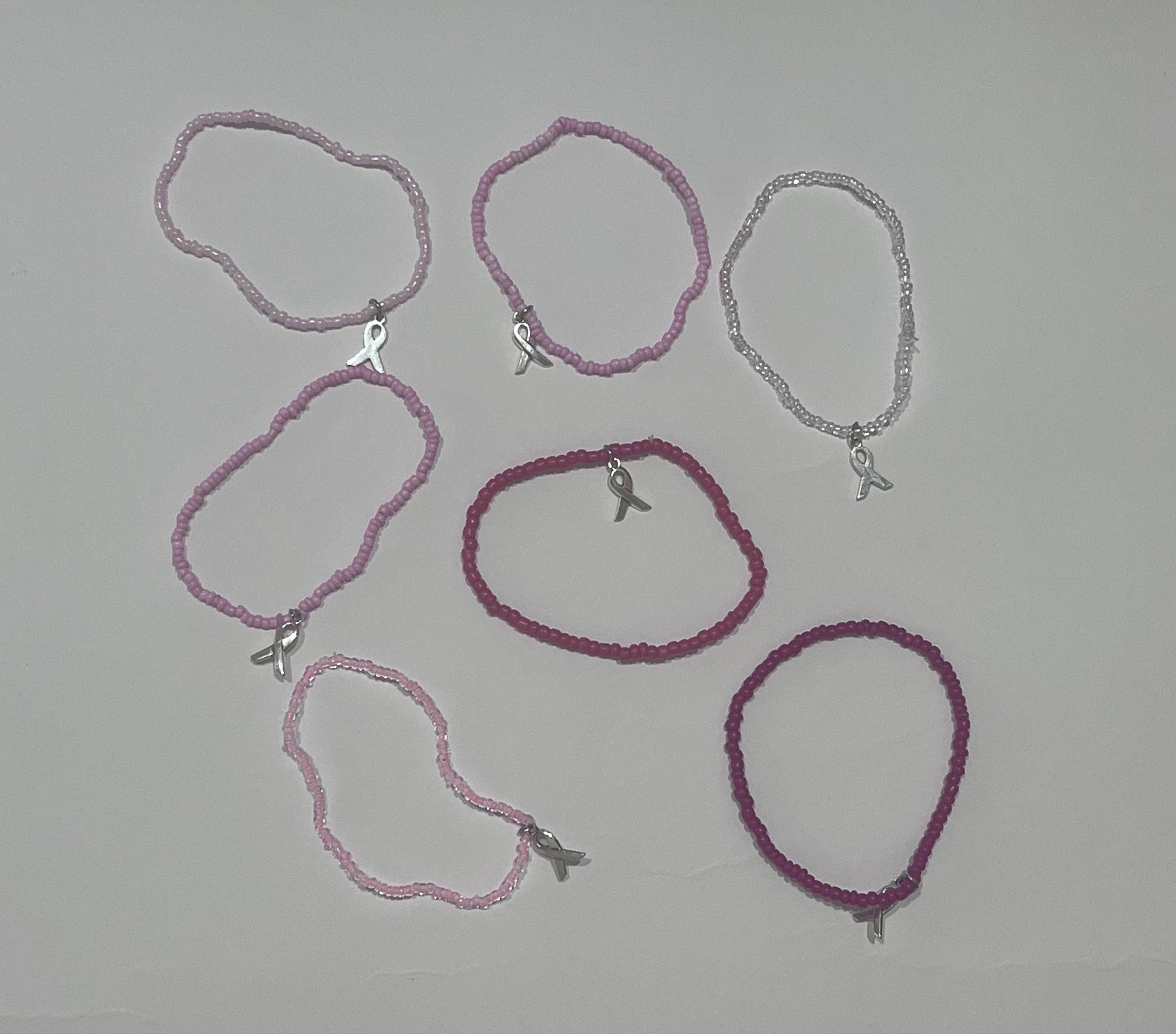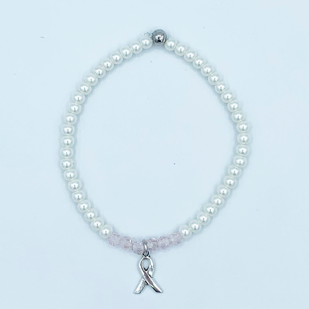 Pulsera ajustable perlas blancas y (piedras rosas, opcionales), lazo y engarce metálicos.